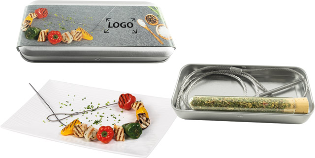 Beschreibung: Edel und nachhaltig sind sowohl die Dose als auch unser Edelstahl-Grilldraht. Sie sind wiederverwendbar und auch optisch ein Blickfang. Zum Marinieren der Grillstücke werden Grillkräuter mitgeliefert. Die Banderole bietet viel Platz für Ihre Werbebotschaft oder, ebenfalls ab 100 Stück, für Ihre individuelle Gestaltung.