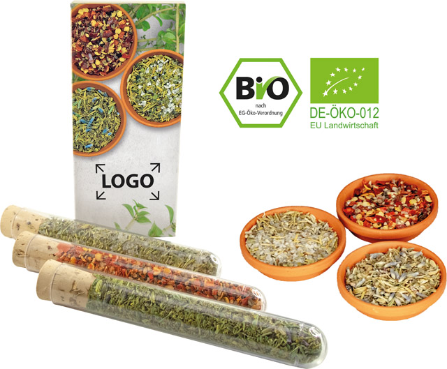 Beschreibung: Ein dreifaches Hoch auf unsere BIO-Kräuter! r Ihre Werbebotschaft mit Bio-Qualität. Die Packung kann ab 250 Stück mit Ihrem Logo versehen oder individuell gestaltet werden.