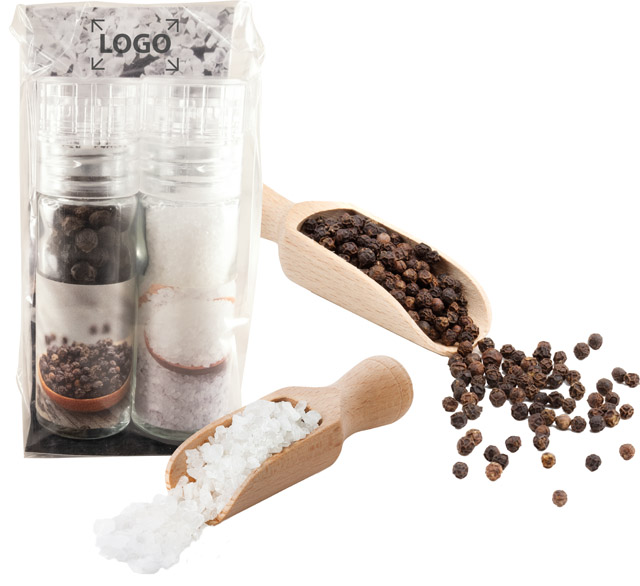 Beschreibung: Ein feines Präsent für jeden Gourmet. Zwei kleine Mühlen aus Glas aus europäischer Produktion. Grobes Meersalz und Pfefferkörner lassen sich damit problemlos zerkleinern. Das Wiederauffüllen, auch mit anderen Gewürzen, sorgt für Nachhaltigkeit. Der Einlege kann ab 100 Stück mit Ihrem Logo versehen oder individuell gestaltet werden.