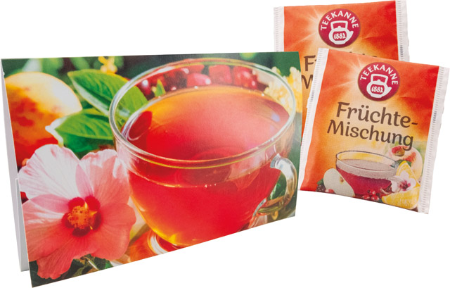 Beschreibung: Das Klappkärtchen beinhaltet zwei praktische Teebeutel mit Früchtemischung. Ob heiße Tasse für entspannende Momente oder fruchtige Erfrischung als Eistee: Mit intensivem Geschmack, leuchtender Farbe und natürlicher Süße – ganz ohne Zusatzstoffe. Eine Werbeanbringung auf dem Standardmotiv oder die individuelle Gestaltung der Karte ist bereits ab 250 Stück möglich.