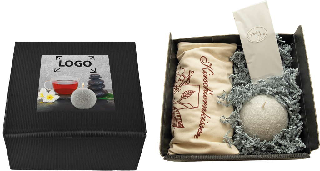 Beschreibung: Entspannung und Wärme, das können Ihre Kunden mit unserem Winter-Wellness-Set genießen. Das Kirschkernkissen bietet eine lang anhaltende Wärme, der Tee und die Kerze Behaglichkeit. Der Natur-Baumwollstoff kann ab 100 Stück bedruckt werden. Weitere Stoff-Farben (rot, grün, blau, gelb, weiß) und andere Abmessungen sind möglich. Eine separate Karte aus unserem Sortiment oder Ihre gewünschte Beilage dienen als Werbeträger.