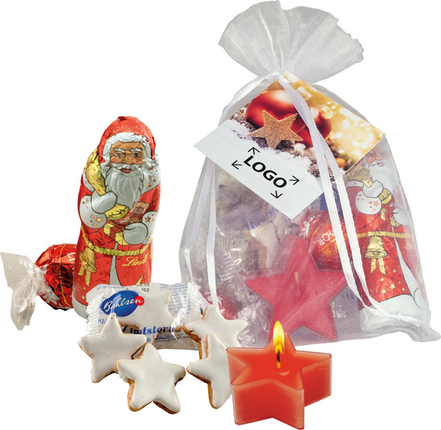 Beschreibung: Eine kleine Aufmerksamkeit zur Weihnachtszeit. Lindt Schokolade, Lebkuchen und Zimtsterne bringen, zusammen mit der Sternkerze, weihnachtliche Stimmung in den Büroalltag. Nutzen Sie das Anhängekärtchen im Standardmotiv für den Werbeeindruck oder, ebenfalls ab 250 Stück, für eine individuelle Gestaltung.