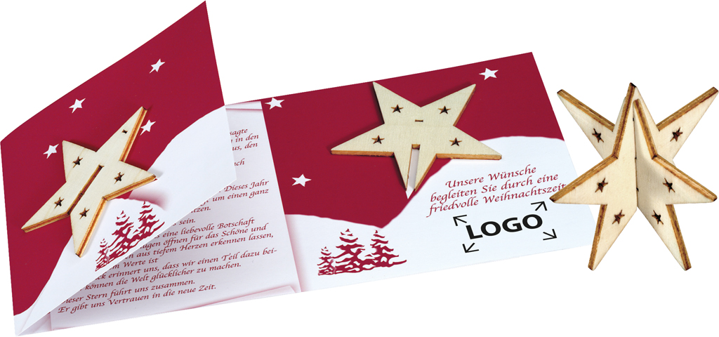 Beschreibung: Diese ansprechende Weihnachtskarte enthält 2 Holzteile, die zu einem Holzstern zusammengesteckt werden können. Platz für den Werbedruck ist auf dem Standardmotiv der Karte oder eine eigene Gestaltung, jeweils ab 100 Stück. Ein Kuvert ist separat erhältlich Art. 6101.