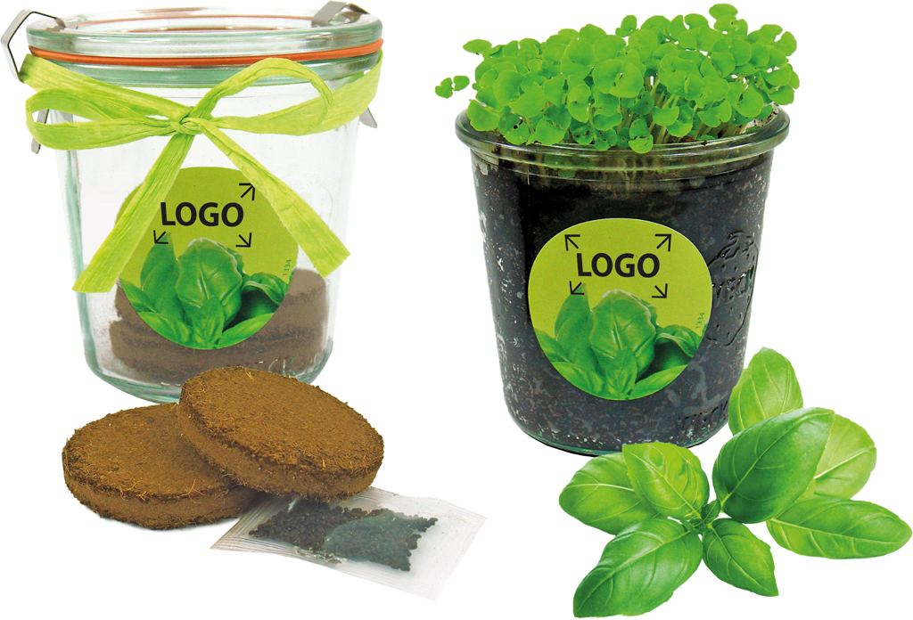 Description: Un bocal qui vous sert comme récipient transparent pour faire croître les herbes aromatiques. Les feuilles du basilic accompagnent parfaitement les plats de tomates. L’étiquette avec votre promotion est toujours visible. Un marquage ou votre personnalisation en quadri est possible à partir de 250 exemplaires.