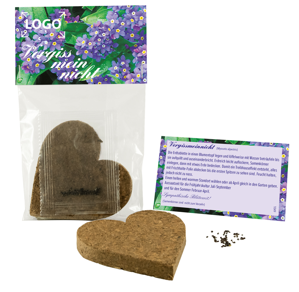 Description: Notre plaquette de terre en forme de cœur est une affaire chaleureuse. Ensemble avec les graines de myosotis, une „accroche“ réussie qui plaît à tout le monde. Le cavalier peut être personnalisé avec votre message à partir de 250 exemplaires.
