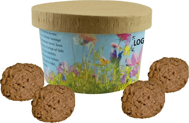 Description: Le gobelet soutenable comprend quatre wonder balls. Les billes en argile faites à la main contiennent des graines et sont faciles à utiliser. Il suffit de la presser dans le terreau et d’arroser. Votre marquage ou une personnalisation en quadri de la bande papier est possible à partir de 250 exemplaires.