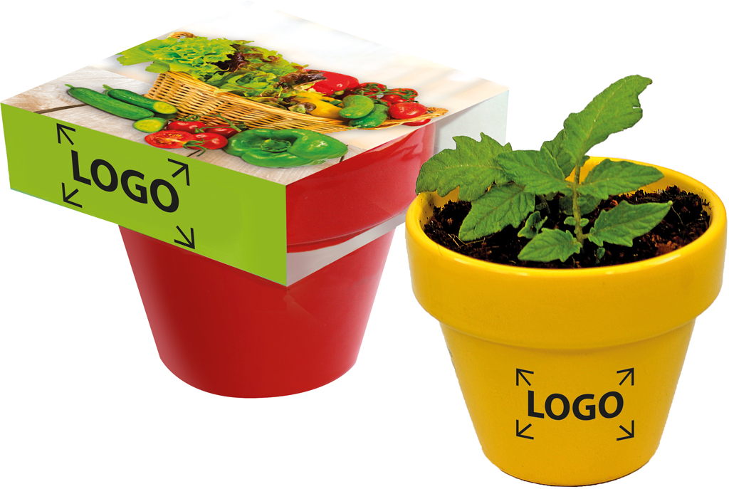 Description: Des pots colorés et des délicieux légumes. C'est une combinaison idéale. Les coloris disponibles sont blanc, rouge et jaune . Pour les graines de légumes vous pouvez choisir entre tomate cerise, poivron ou mélange de salade. Un marquage sur le motif standard ou votre personnalisation en quadri de la bande papier est possible à partir de 250 exemplaires.