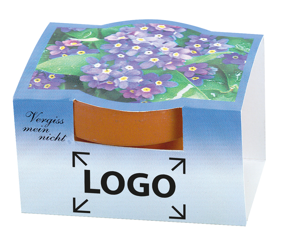 Composition: pot en terre cuite Ø 4 cm, plaquette de terre, graines: myosotis