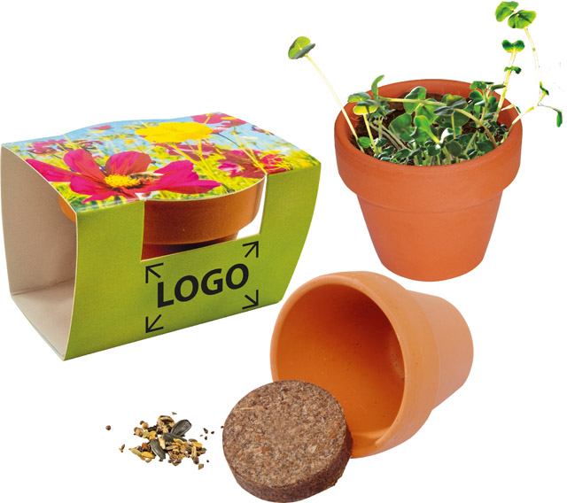 Description: Fleuri, ensoleillé, frais : ce sont les slogans qui valent pour cet article. Dans le petit pot en terre cuite vous avez la plaquette de terre et les graines. Marquage possible sur le motif standard ou votre personnalisation en quadri de la bande papier à partir de 250 exemplaires. Tampographie sur le pot en terre cuite à partir de 100 exemplaires.