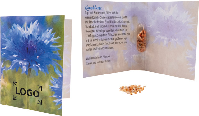 Description: La capsule végétalienne et soluble dans l‘eau contient des graines de bleuet. Faites plaisir à vos clients avec cette splendeur des fleurs bleues dans un emballage non conventionnel. Un marquage publicitaire sur le motif standard ou la personnalisation de la carte est possible à partir de 250 exemplaires.