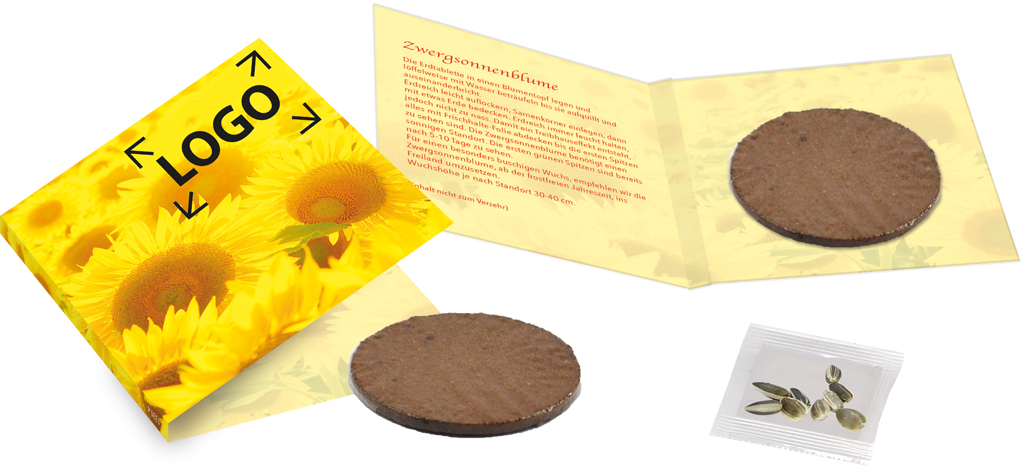 Description: La petite carte à volet contient tout ce qu’il faut pour faire croître son propre mini tournesol. Il y a une plaquette de terre et les graines. Le mode d’emploi est imprimé à l’intérieur. Marquage possible sur le motif standard ou votre personnalisation en quadri de la carte à partir de 250 exemplaires.