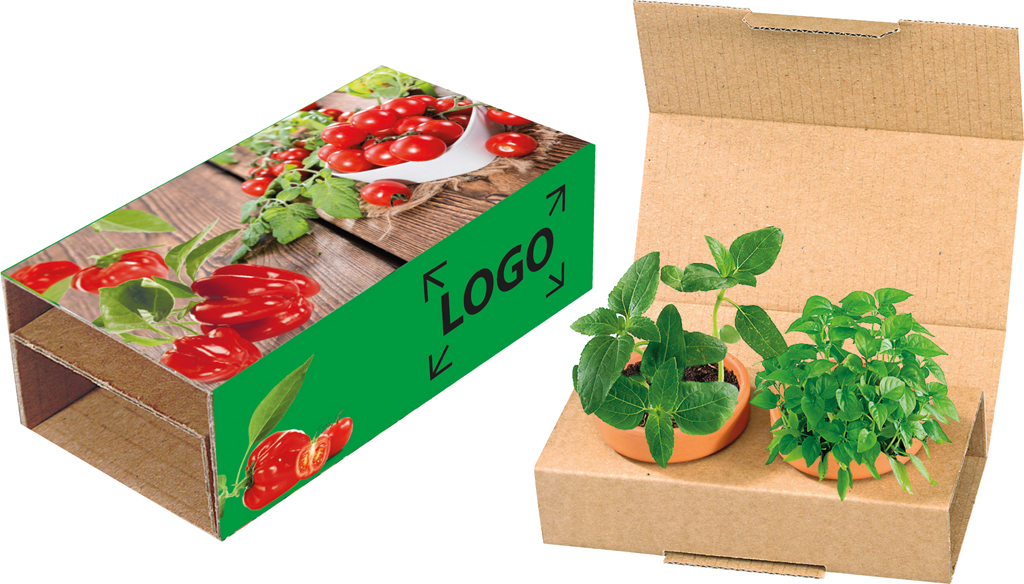 Description: Deux sortes de graines de légumes pour un snack sain. Il y a les graines de tomate cerise et de poivron. C’est un duo idéal pour une coopération croissante. Utilisez la bande papier pour votre marquage. Une personnalisation en quadri de la bande est aussi possible à partir de 250 exemplaires.