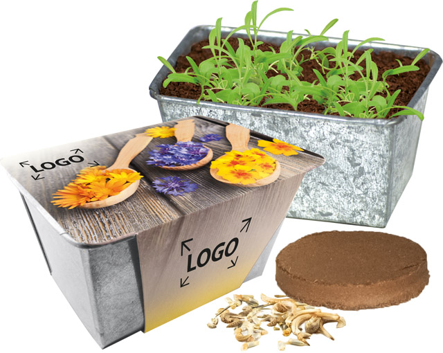 Description: Elle est moderne, métallique et petite, cette caisse en zinc pour vos semailles. La petite caisse contient la plaquette
