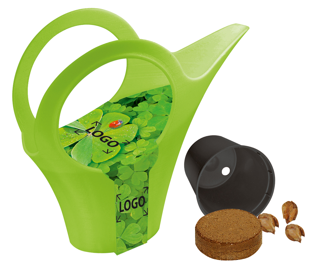 Composition: arrosoir en plastique 0,2 l, pot en plastique Ø 6 cm, plaquette de terre, graines: bulbes de trèfle à 4 feuilles, coloris: blanc 01, vert 02, jaune 04, orange 05