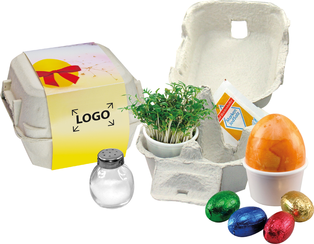 Description: Offrez ce petit déjeuner de Pâques et la surprise est garantie. L’ensemble comprend quatre ŒUFs en chocolat, une salière, des graines de cresson, un ŒUF dur et une prise de sel. Utilisez la bande papier pour votre marquage. Votre personnalisation en quadri de la bande papier est aussi possible à partir de 250 exemplaires.