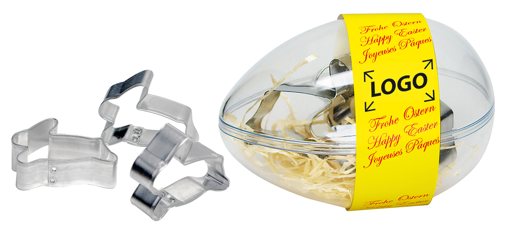 Description: 3 emporte-pièces lapin dans une boîte transparente en forme d’oeuf. La carte recette se trouve sur la bande papier. Personnalisation en quadri à partir de 250 exemplaires.