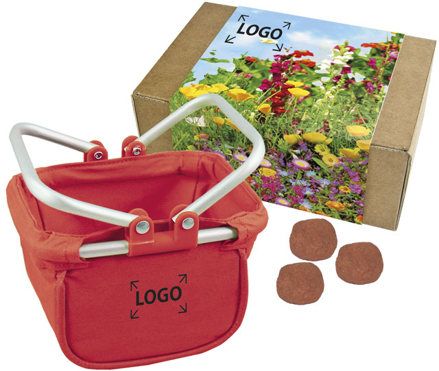 Description: Le Utensilo Wonderball avec des bille en argile magiques remplies de graines de fleurs. Un cadeau durable et efficace. Il suffit de presser les billes d‘argile faites à la main dans la terre et de les arroser. Le panier Utensilo peut alors être utilisé comme conteneur de stockage à plusieurs usages. Votre marquage sur le motif standard ou une personnalisation en quadri de la bande papier est possible à partir de 100 exemplaires.