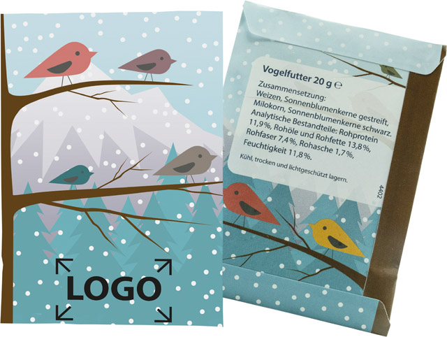 Description: Graines pour les oiseaux dans un sachet collé. Ainsi vos clients peuvent offrir une table bien garnie aux oiseaux sédentaires. À partir de 1.000 exemplaires, une personnalisation du sachet est possible. Un sachet en papier à base d’herbe est aussi possible sur demande.