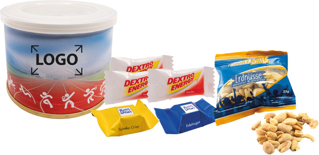 Description: Une petite canette pleine d’énergie et force. Dans la canette vous trouvez des cacahuètes, du chocolat et du dextrose. Un article promotionnel parfait quand un évènement sportif est imminent. Vous pouvez utiliser la bande papier pour votre marquage ou, également à partir de 250 exemplaires, pour votre personnalisation en quadri.