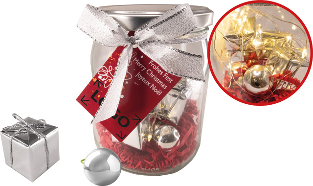 Composition: guirlande lumineuse LED (sans 2 batteries CR2032), 4 boules argent, 3 boîtes cadeau