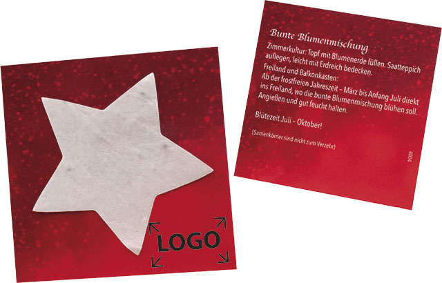 Description: Une étoile qui peut pousser même pendant la saison froide. Il suffit de poser le papier à graines sur le sol et de l'arroser. Les premières pointes vertes apparaîtront bientôt. Votre marquage ou une personnalisation en quadri de la carte est possible à partir de 250 exemplaires.