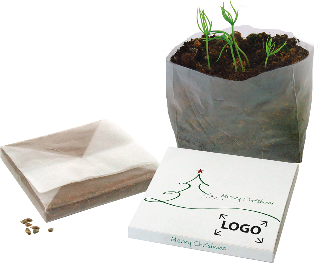 Description: Ce kit de semis carré est composé par une plaquette de terre et des graines d’épicéa pour votre sapin de Noël. Le format plat du kit est facile à remettre comme giveaway. Il ne faut que baigner la plaquette de terre et votre petit sapin commençera rapidement à croître. Une personnalisation en quadri est possible à partir de 250 exemplaires.