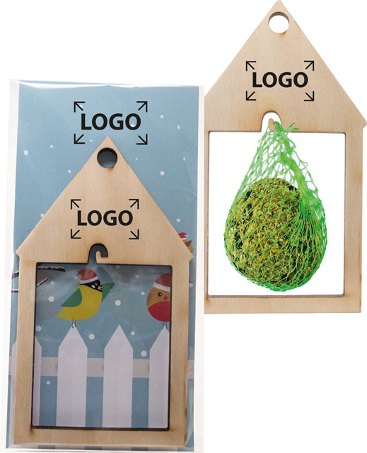 Description: Le mangeoire en bois peut être suspendue presque partout avec une boule de graisse. Après peu de temps vous pouvez regarder les oiseaux en mangeant. Votre marquage ou une personnalisation en quadri de la carte est possible à partir de 250 exemplaires.