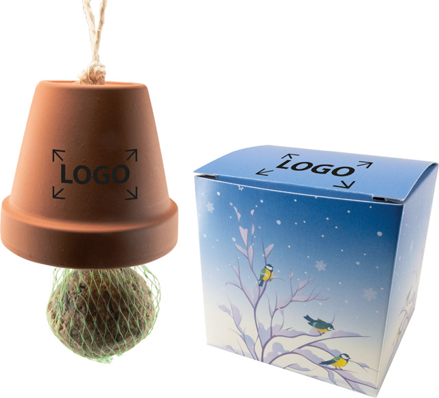Description: Un abri complet pour les oiseaux sédentaires. Il suffit d’attacher la boule de graisse avec le fil de chanvre et de suspendre. Une personnalisation en quadri de la boîte cadeau est possible à partir de 250 exemplaires.