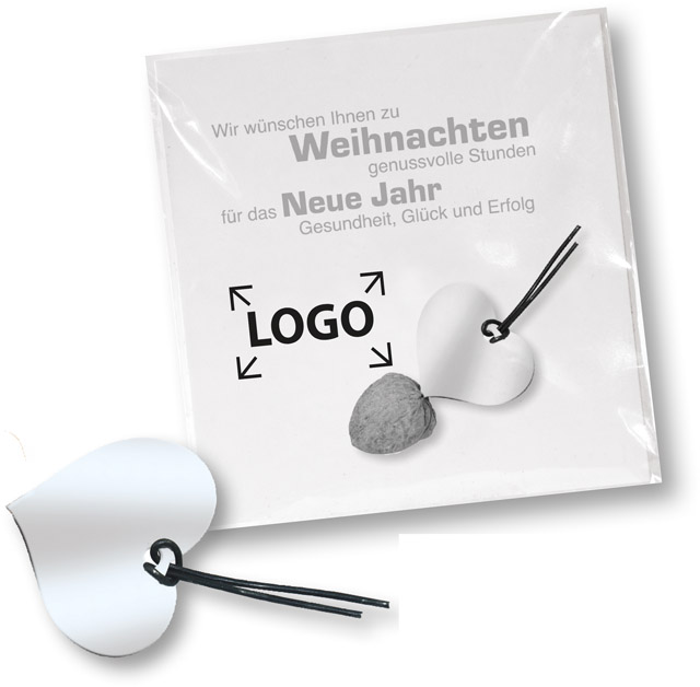 Description: Carte avec casse-noix en acier inoxydable en forme de coeur dans une pochette transparente (sans noix). Marquage à paritr de 250 exemplaires.