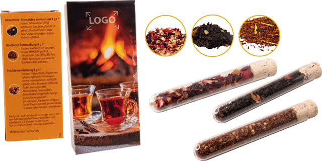 Description: Trois sortes de thé de qualité supérieure sont contenues dans les tubes réutilisables. Il y en a certainement pour tous les goûts et vos clients pourront se réchauffer avec une délicieuse tasse de thé pendant les froides journées d'hiver. Votre marquage ou une personnalisation en quadri de la boîte est possible à partir de 250 exemplaires.