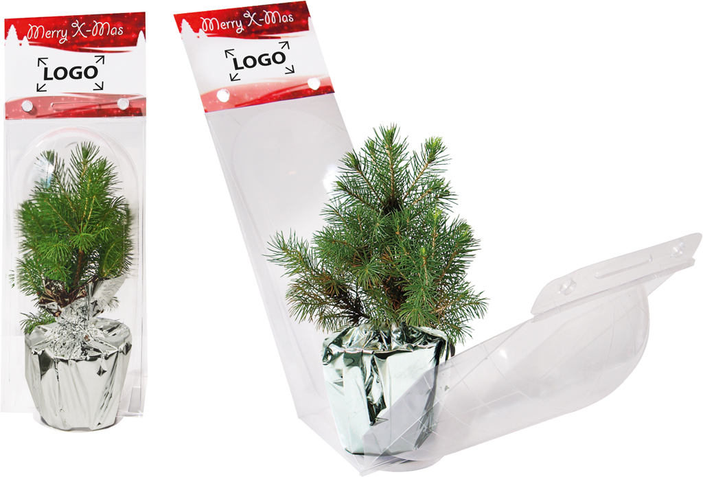 Description: Petit sapin env. 20 cm dans une boîte transparente. Marquage à partir de 100 exemplaires sur le motif standard ou personnalisation en quadri de la carte.