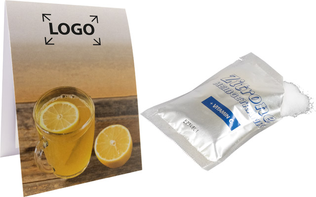 Description: Après une belle promenade dans la neige ou pour prévenir un rhume, une boisson chaude au citron est le moyen juste. C’est vite et simplement préparé avec de l’eau chaude. Votre marquage ou une personnalisation en quadri de la carte est possible à partir de 250 exemplaires.