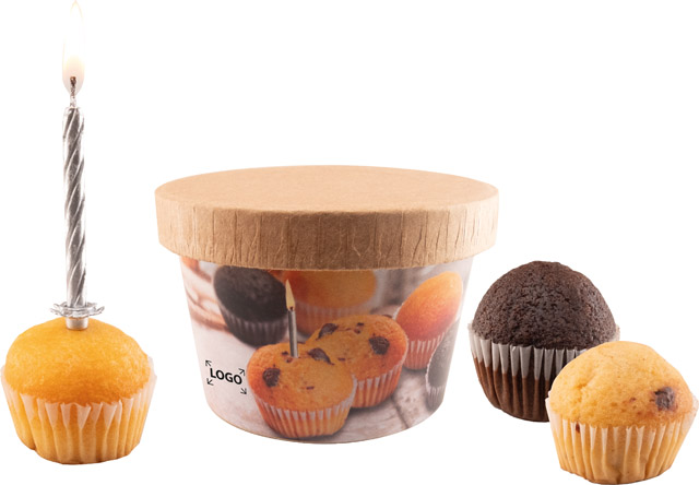 Description: Le délicieux muffin et la bougie créent une ambiance de Noël. Vos clients apprécieront particulièrement la période de l'Avent. Votre marquage ou une personnalisation en quadri de la bande papier est possible à partir de 250 exemplaires.
