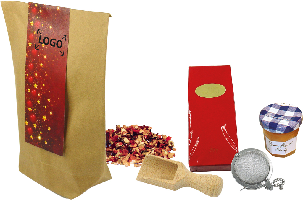 Description: Notre nouvelle Pochette de Noël contient tout ce qu’il faut pour préparer une bonne tasse de thé. Il y a du thé aux fruits, une boule à thé, du miel et une pelle à épices pour doser le thé. Une personnalisation en quadri de la carte est possible à partir de 100 exemplaires.
