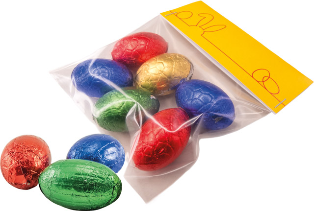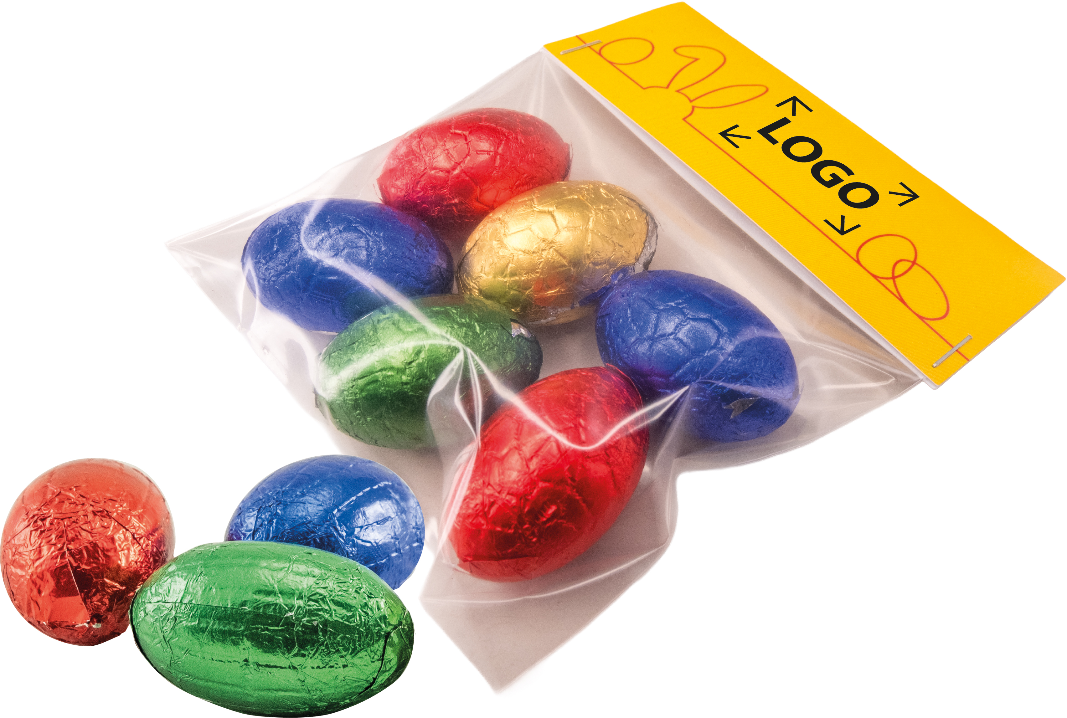 Beschreibung: Verstecken, entdecken, genießen – so beginnt das Ostervergnügen, das Ihre Kunden lieben! Die zartschmelzenden Schokoladeneier sorgen für süße Genussmomente und machen Ihr Werbeosternest zu etwas ganz Besonderem. Präsentieren Sie Ihre Botschaft stilvoll auf dem Header – individuell gestaltet oder mit Ihrem Logo, bereits ab 250 Stück.