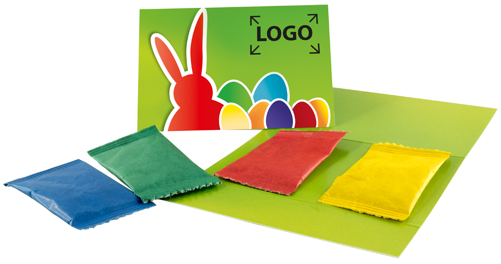 Beschreibung: Ein sympathischer Mailing-Beileger für Ihre Osterbotschaft. Die einfache Handhabung für die zwei Farbpulver-Tütchen in rot, gelb, blau oder grün ist auf der Karte erklärt. Ihr Werbeeindruck oder eine individuelle Gestaltung der Karte ist ab 250 Stück möglich.