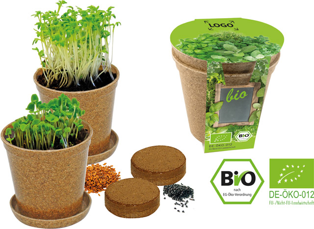 Beschreibung: Ein Giveaway Natur pur. Der aus organischem Material hergestellte Topf kann später direkt in die Erde gesetzt werden und verrottet dort komplett nach einigen Monaten. Mit den Bio-Samen Basilikum und Kresse ist es ein ideales natürliches Werbepräsent. Die Banderole kann mit Ihrem Eindruck versehen oder, ebenfalls ab 250 Stück, individuell gestaltet werden.