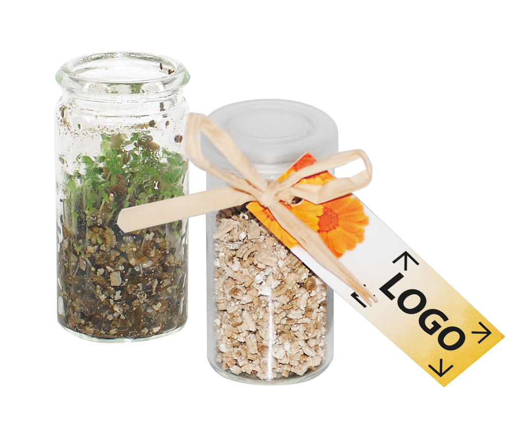 Beschreibung: Ein Gewächshaus im Miniaturformat, das auch auf dem Schreibtisch oder auf der Fensterbank stehen kann. Im Gläschen ist bereits das Wachstumsgranulat mit den Samenkörnern enthalten. Auf der Anhängekarte ist die Anleitung bereits aufgedruckt. Auf der Vorderseite ist ausreichend Platz für Ihren Werbeeindruck. Auch eine eigene Gestaltung ist ab 250 Stück möglich.