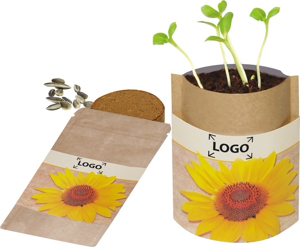 Beschreibung: Natur-Bag, der kleine Garten aus der Tüte. Öffnen, Erdtablette quellen lassen und das Saatgut einsäen. Die Naturtüte fängt durch die Innenkaschierung die Feuchtigkeit auf. Die umlaufende Banderole ist während der Wachstumsphase stets im Blickfeld. Werbeaufdruck auf dem Standardmotiv oder eine eigene Gestaltung ab 250 Stück.