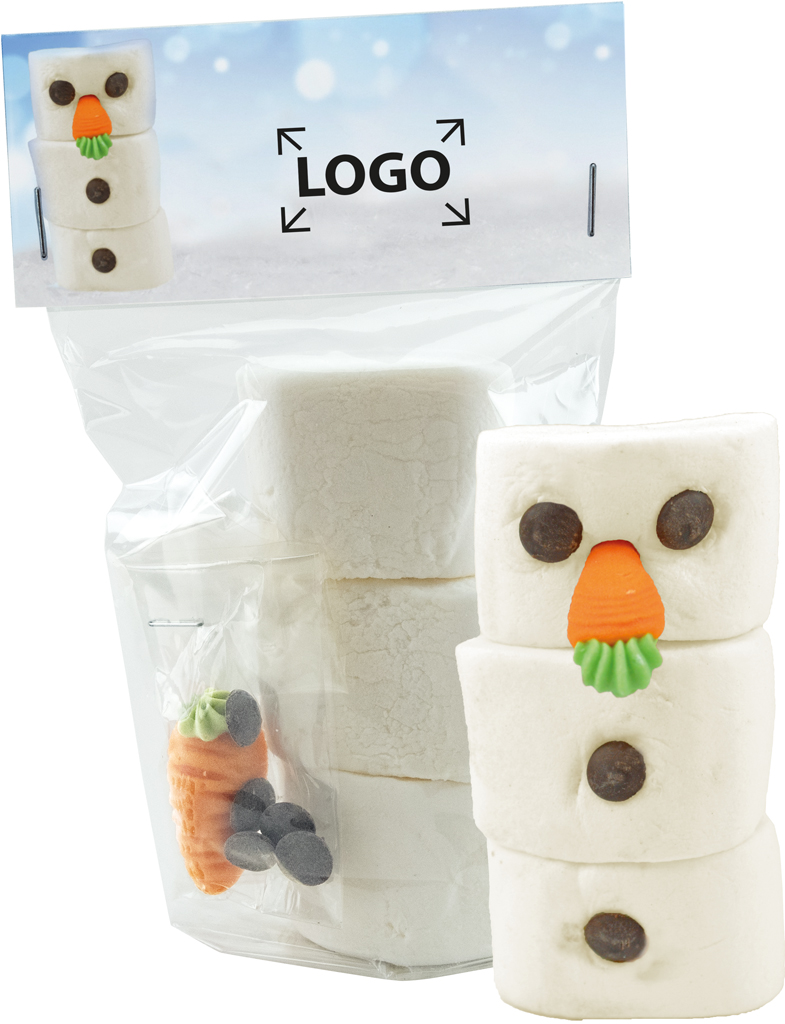 Beschreibung: Ein kleiner Schneemann zum Naschen. Einfach die Schaumzuckerstück mit einem Zahnstocher verbinden, die Möhre als Nase und die Schokotropfen als Augen und Bauchknöpfe verwenden. Schon ist der Schneemann fertig. Ihr Werbeeindruck oder eine individuelle Gestaltung des Headers ist ab 250 Stück möglich.