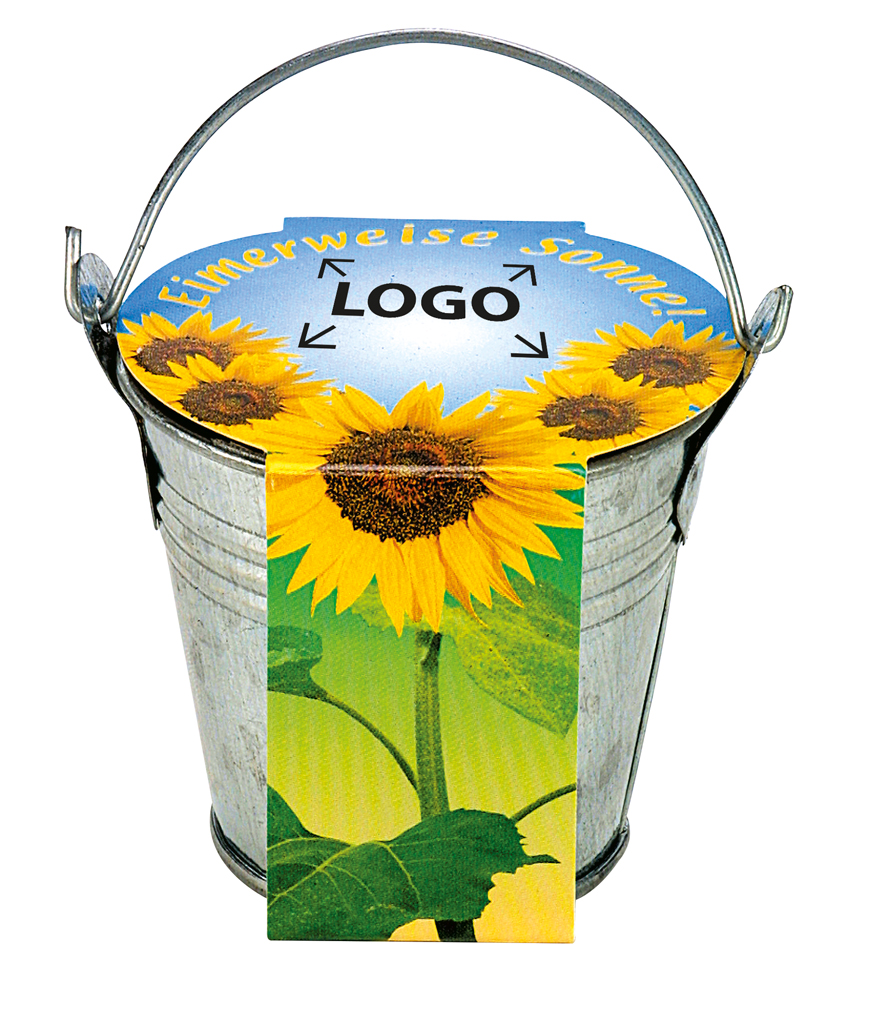 Beschreibung: Das kleine Zinkeimerchen enthält ein Tontöpfchen, Erdtablette und Zwergsonnenblumen-Samen. Ein handliches Giveaway für Ihre wachsende Werbebotschaft. Ihre eigene Gestaltung der Banderole bereits ab 250 Stück.