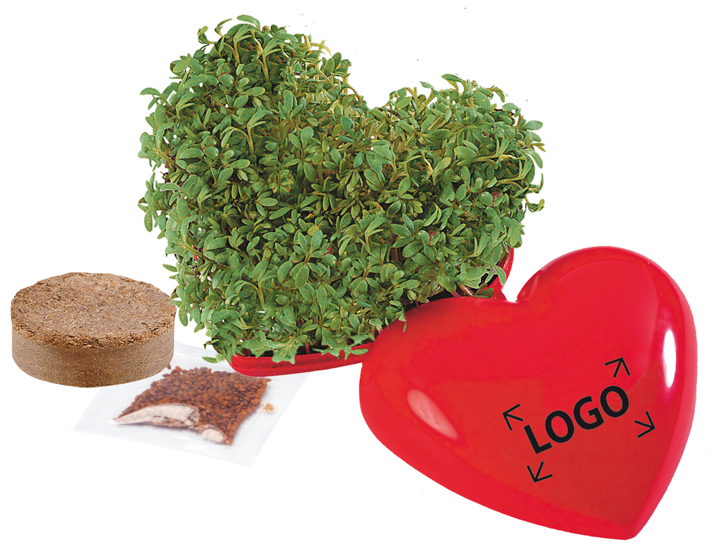 Beschreibung: Für gesunde Geschäftsbeziehungen und solche, die schnell wachsen sollen! Die originelle Idee für rasanten Werbeerfolg. Im Mini-Herz wächst innerhalb von wenigen Tagen das gesunde Grün heran. Ihr Werbeeindruck wird auf dem Deckel platziert.