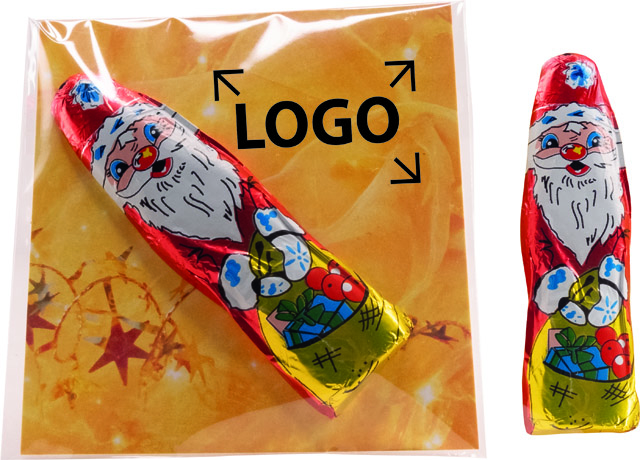 Beschreibung: Über diese kleine Aufmerksamkeit freuen sich Ihre Kunden in der Weihnachtszeit. Der Weihnachtsmann aus Edelvollmilchschokolade ist ideal zum Überreichen. Die Karte kann im Standardmotiv mit Ihrem Logo versehen werden oder, ebenfalls ab 250 Stück, komplett personalisiert werden.