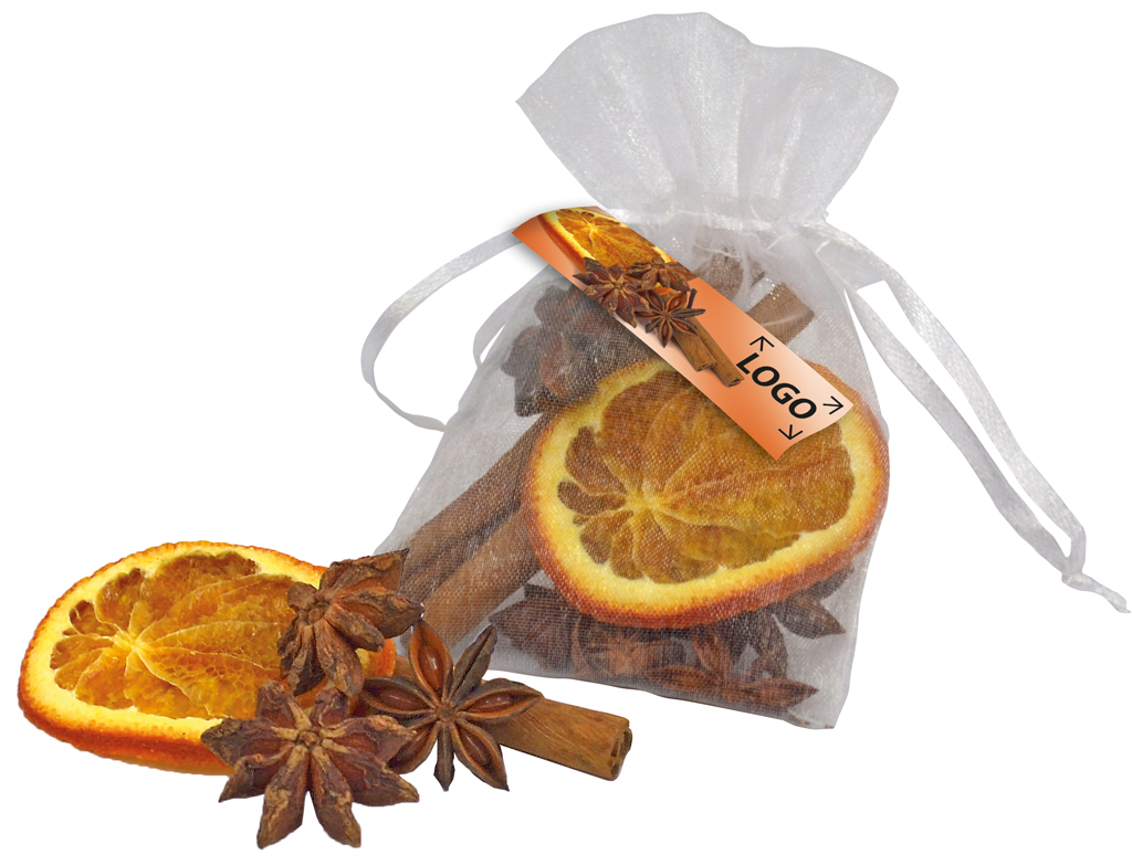Beschreibung: Über dieses Duftsäckchen freut sich jeder. Es vereint die Düfte Zimt, Orange und Anis. Alles ist schön zum Überreichen in einem kleinen Organzasäckchen verpackt. Das Anhängekärtchen bietet die Möglichkeit für den Werbedruck im Standardmotiv oder eine eigene Gestaltung des Kärtchens, jeweils bereits ab 250 Stück.