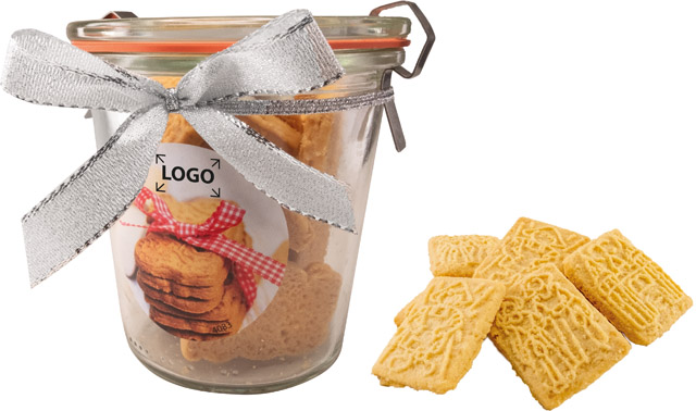 Beschreibung: Das nachhaltige Weckglas, gefüllt mit hochwertigen Butter-Spekulatius, kann auch als Backform oder als Behältnis für Backzutaten verwendet werden. Ihr Werbeeindruck oder eine individuelle Gestaltung des Etiketts ist ab 100 Stück möglich.