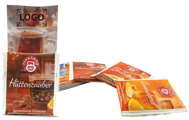 Beschreibung: Vier verschiedene Winterteesorten zum Ausprobieren. Das ist ein Giveaway, das gerne in der kalten Zeit angenommen wird und ihre Werbebotschaft bleibt in Erinnerung. Das Kärtchen kann mit Ihrem Eindruck versehen werden oder ebenfalls ab 250 Stück individuell gestaltet werden.