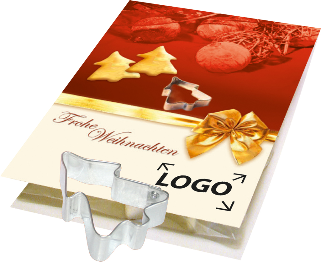 Beschreibung: Ein nettes und nützliches Giveaway für die Adventszeit und zu Weihnachten. Dieses kleine Kärtchen beinhaltet eine Weihnachtsbaum-Ausstechform, die jedes Jahr wieder verwendet werden kann. Ein passendes Rezept befindet sich auf der Rückseite der Karte. Platz für den Werbedruck ist auf dem Standardmotiv der Karte oder eine eigene Gestaltung des Kärtchens, jeweils bereits ab 250 Stück.