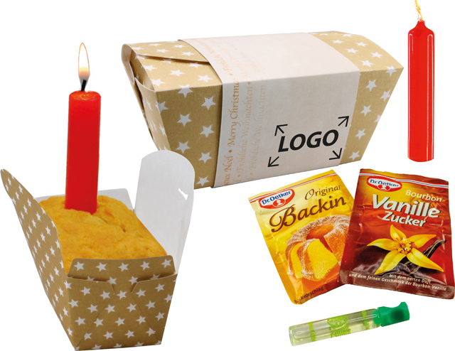 Inhalt: Kerze (ca. 70 mm), Vanillezucker, Backpulver, Zitronenaroma, Rezept auf der Banderole (ohne Gebäck)