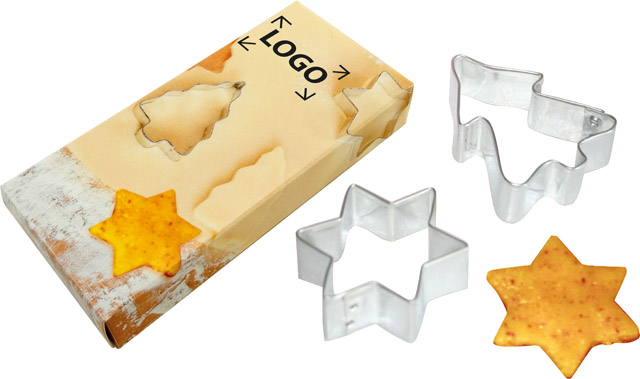 Inhalt: 2 Ausstechformen je ca. 5 cm (Tannenbaum, Stern), Rezept auf Packung (ohne Gebäck)