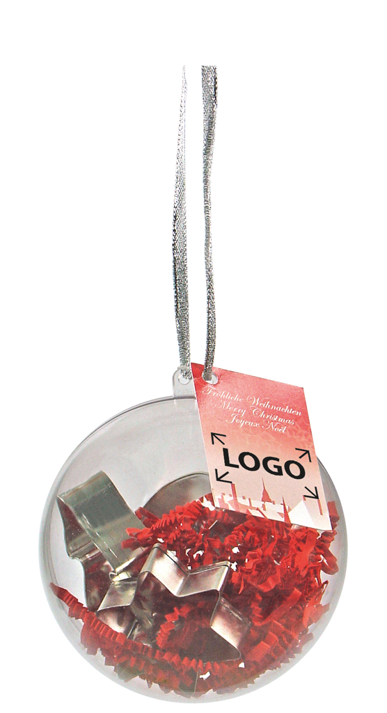 Beschreibung: Eine Weihnachtskugel mit nützlichem Inhalt, an der sich jeder erfreut. Diese besondere Kunststoff-Kugel hat mehrere Funktionen: einmal dient sie zu Deko-Zwecken und kann nach eigenen Wünschen gefüllt werden, zudem enthält sie bereits 4 Ausstechformen (Stern, Tannenbaum, Herz, Kleeblatt) für die Weihnachtsbäckerei. Platz für den Werbedruck ist auf dem Standardmotiv des Anhängekärtchens oder eine eigene Gestaltung des Kärtchens, jeweils bereits ab 250 Stück.